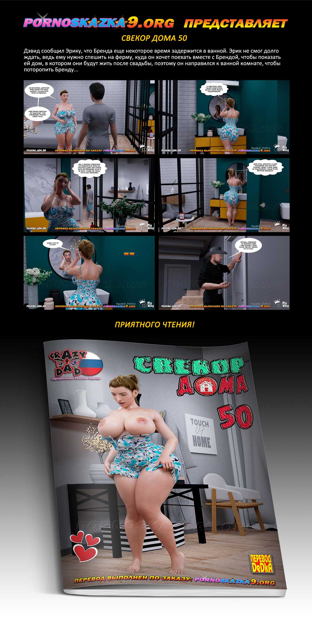 Порно комикс «Свёкор дома. Часть 50». Дэвид сообщил Эрику, что Бренда еще некоторое время задержится в ванной. Эрик не смог долго ждать, ведь ему нужно спешить на ферму, куда он хочет поехать вместе с Брендой, чтобы показать ей дом, в котором они будут жить после свадьбы, поэтому он направился к ванной комнате, чтобы поторопить Бренду…